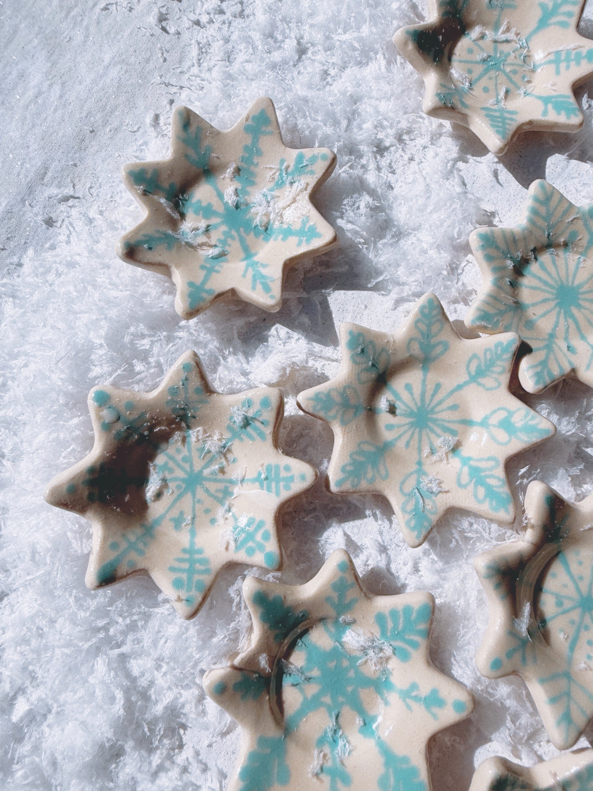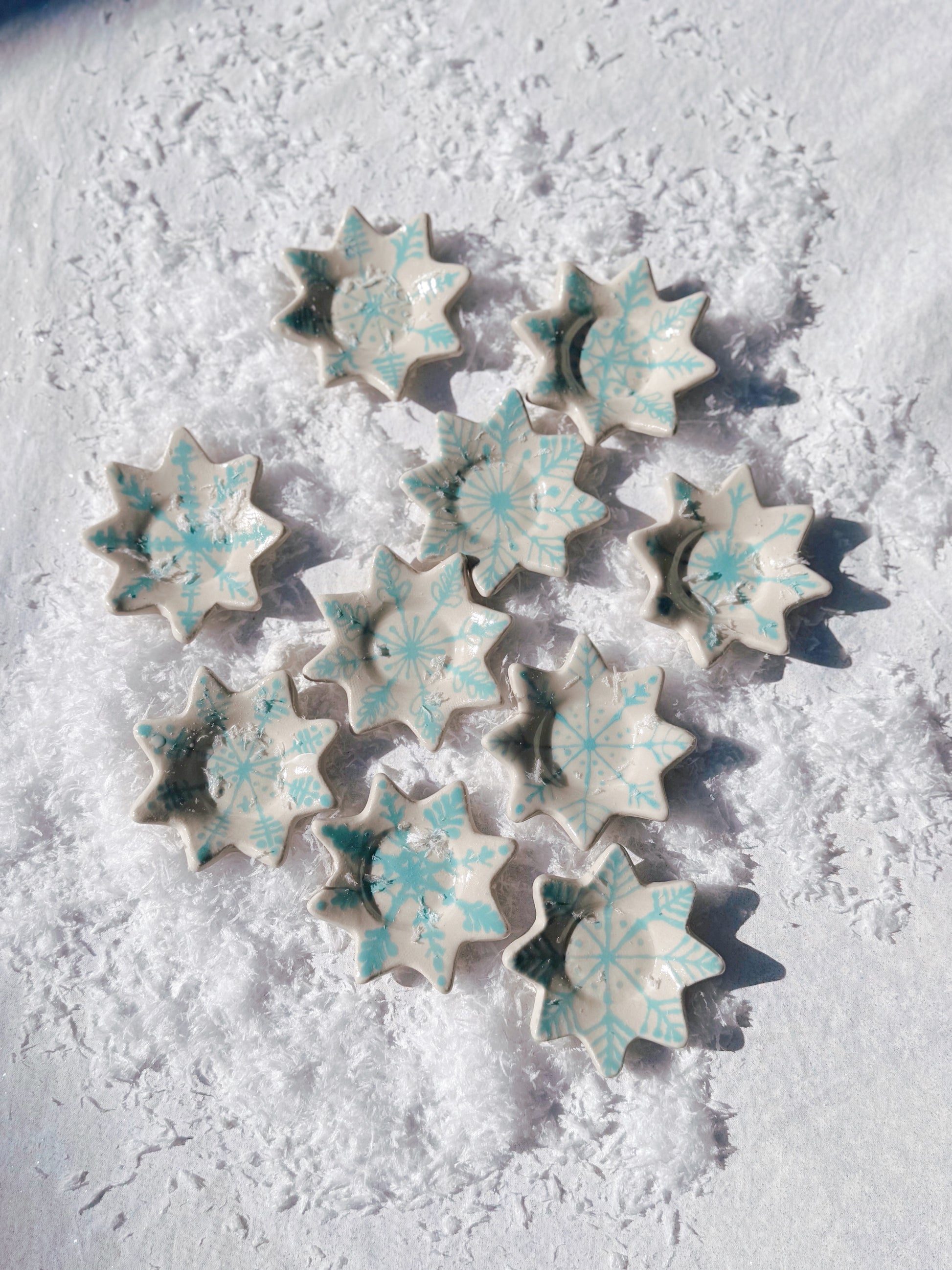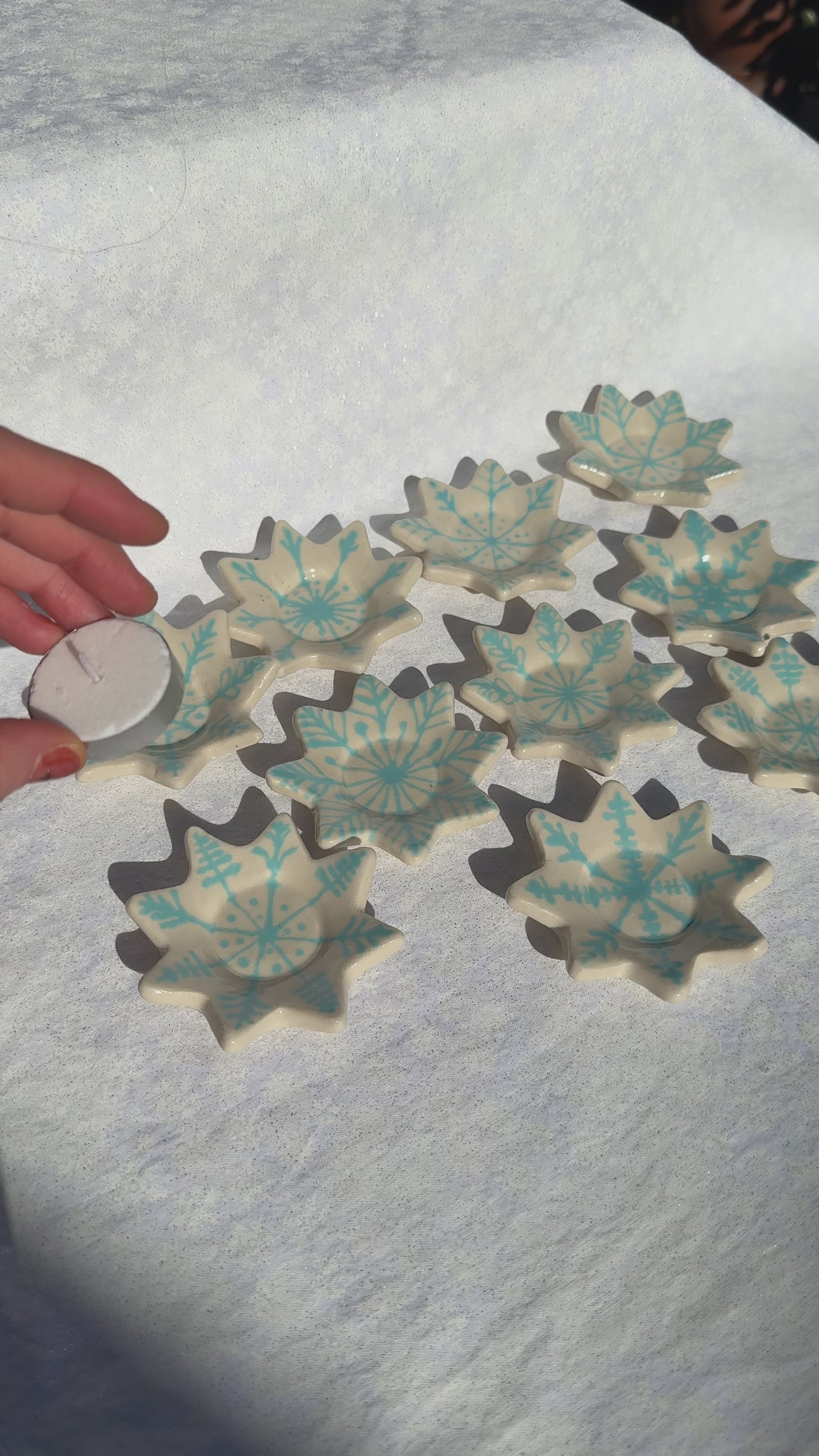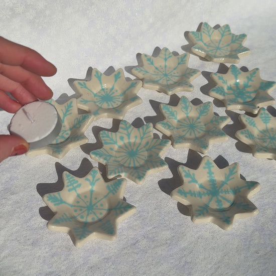 Hand made from reclaimed clay and hand painted these snowflake tea light holders are all unique just like real snowflakes! Add a bit of whimsy to your holiday decor with these cute tea light holders.