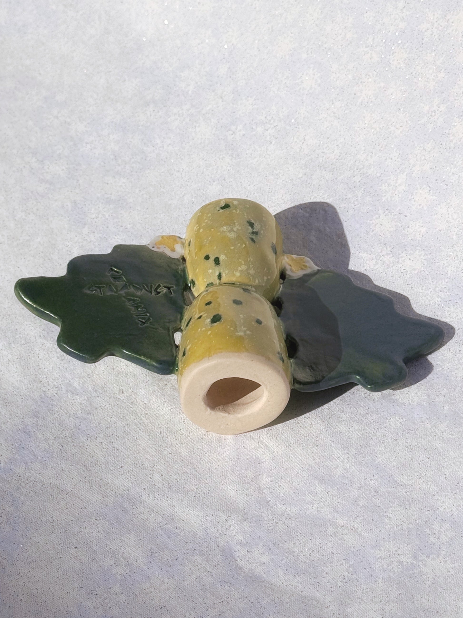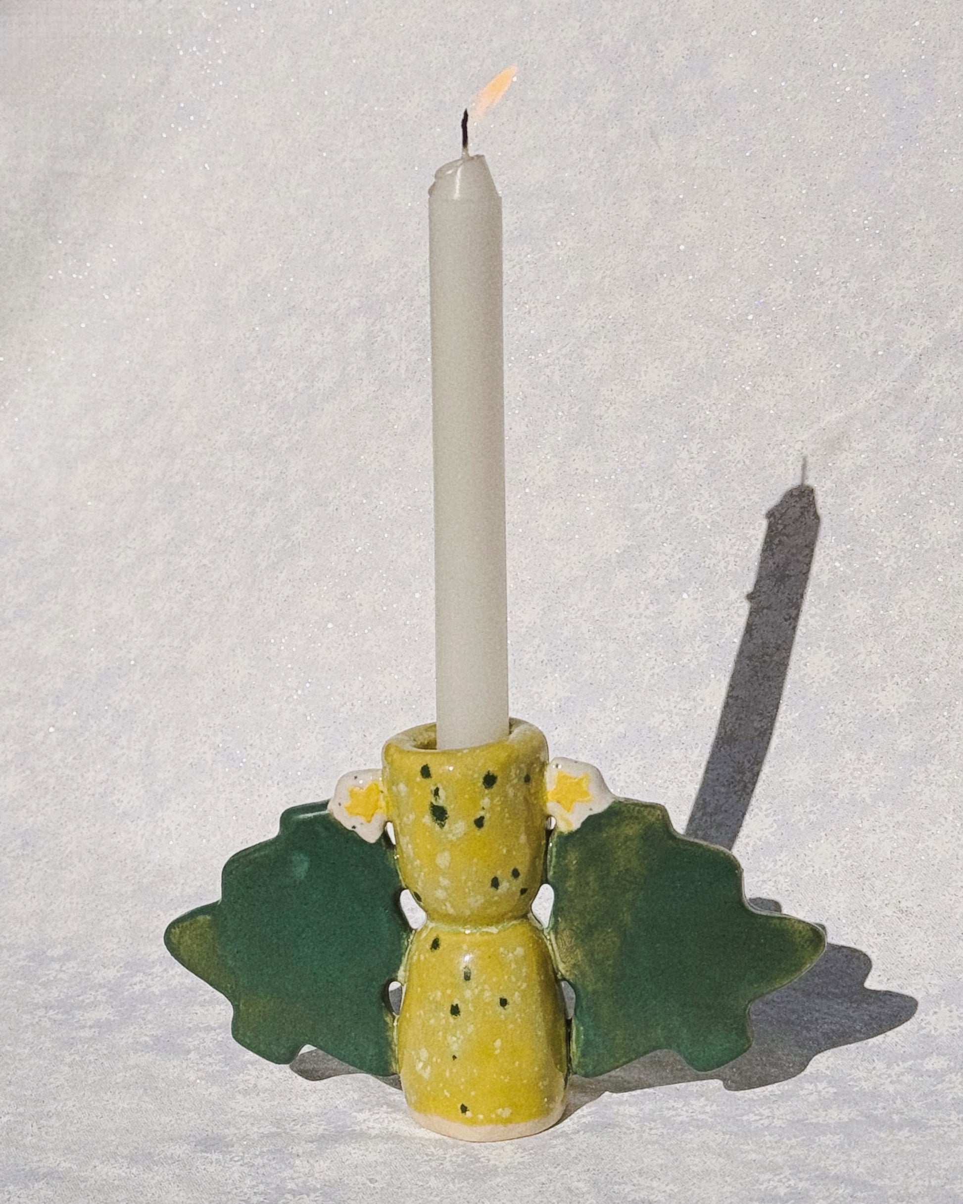 Create a festive atmosphere with these one of a kind hand made ceramic Christmas Tree Candle Holders! Each candlestick holder is hand built with 2 Christmas trees with a cute little star on top and hand painted with a playful speckled green glaze. Fits most tapered candles.