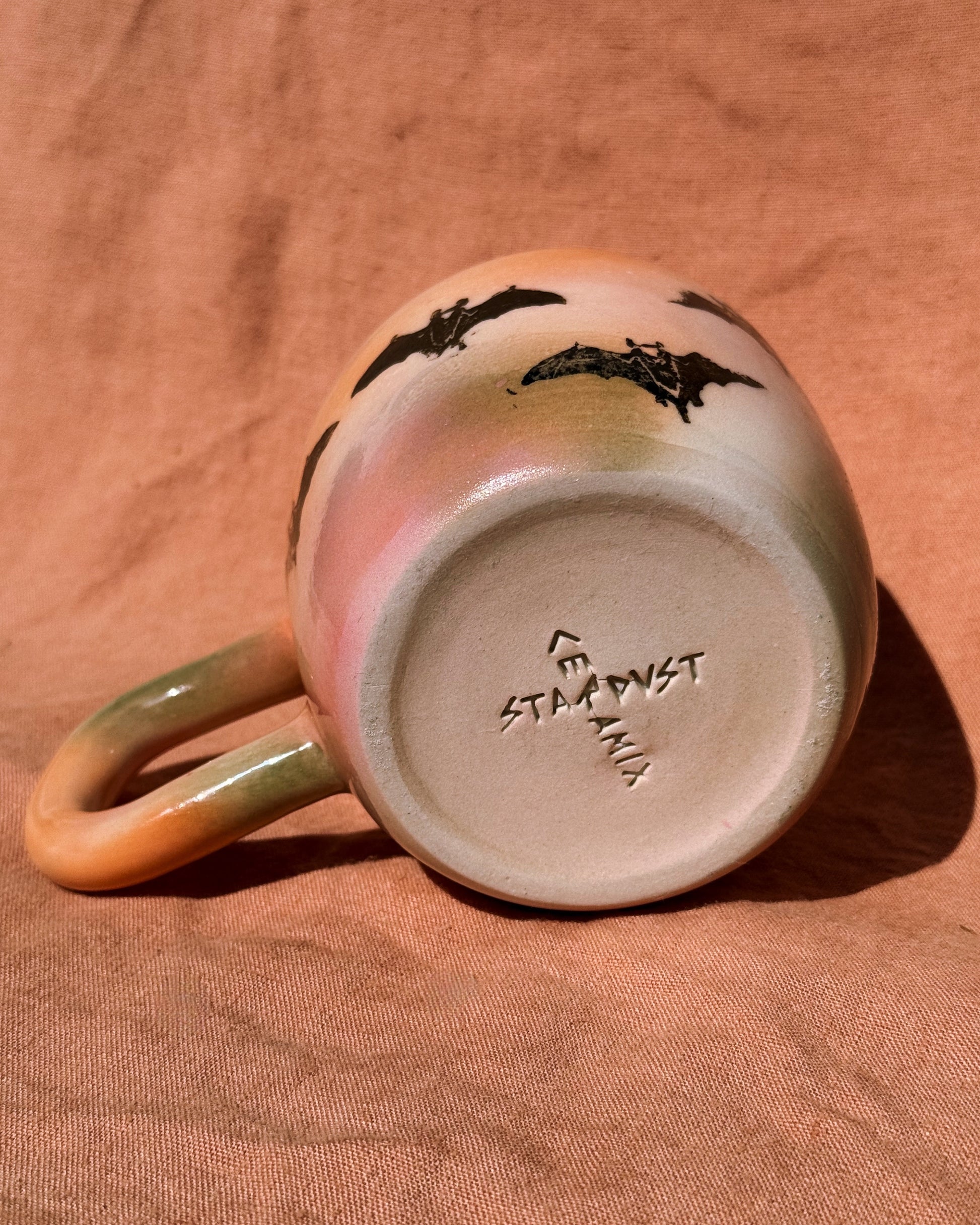 This festive mug is hand thrown using a creamy stoneware clay featuring cute lil batz. 🦇
