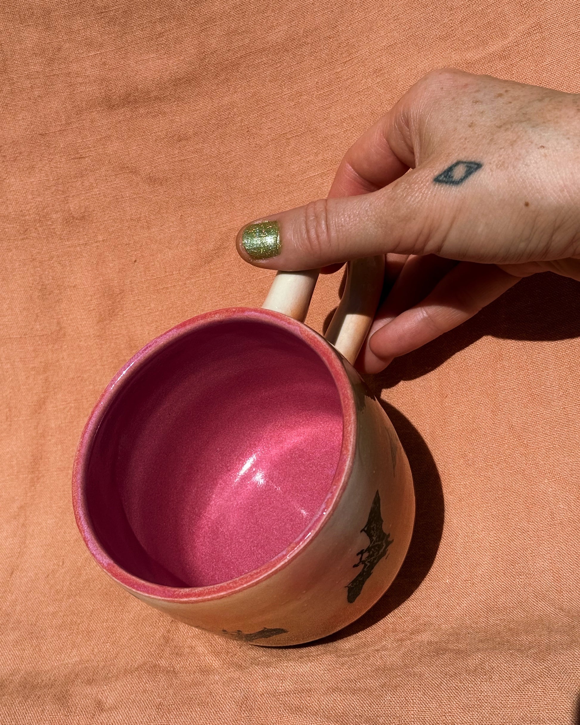 Each mug is airbrushed with halloween colorz and finished with a juicy pink inside to bring in the spooky mood.